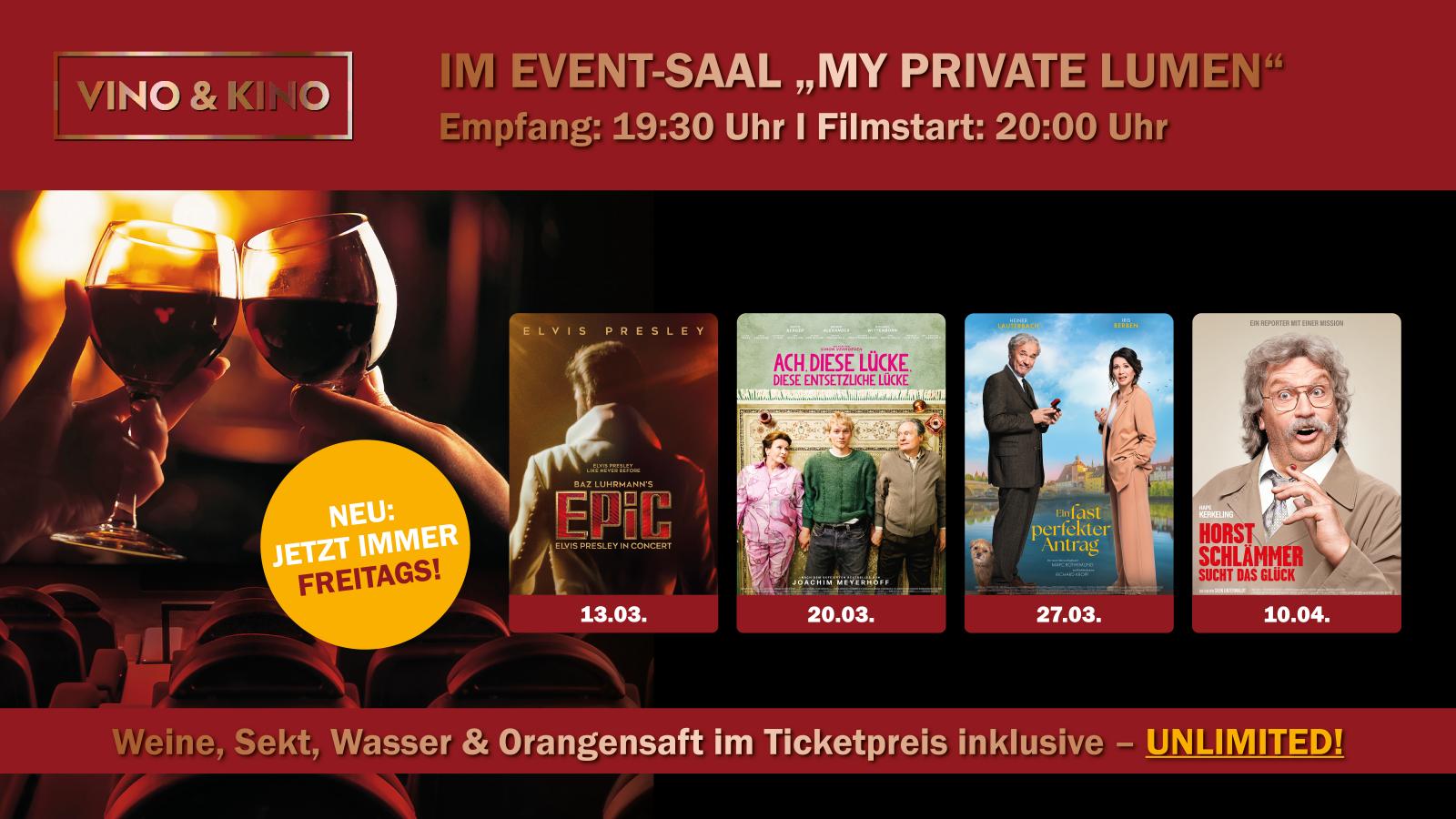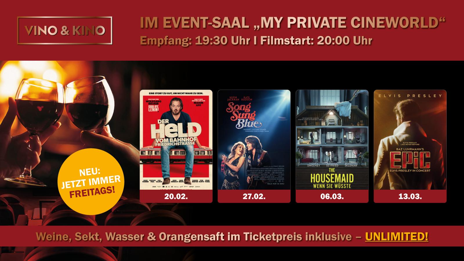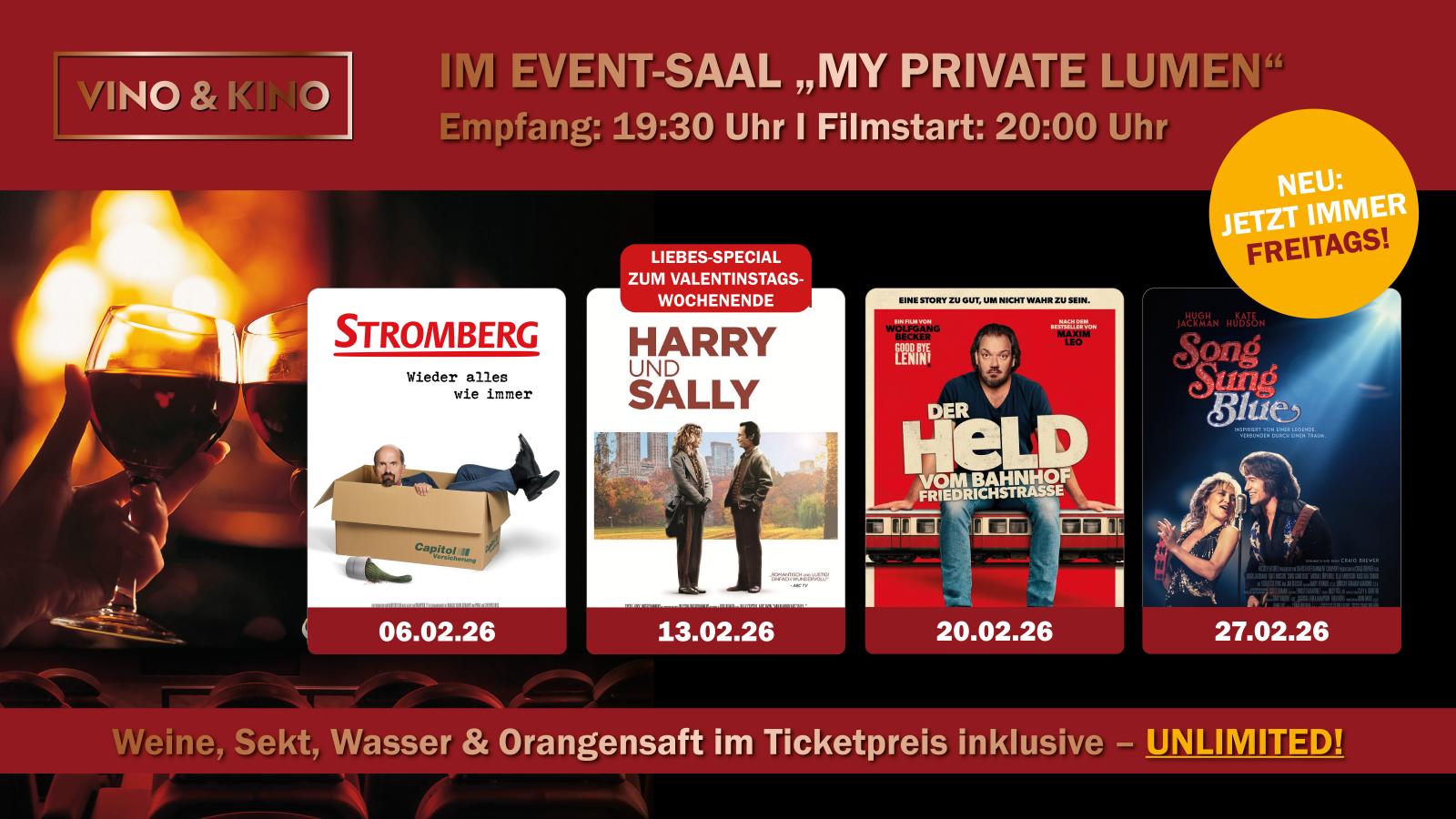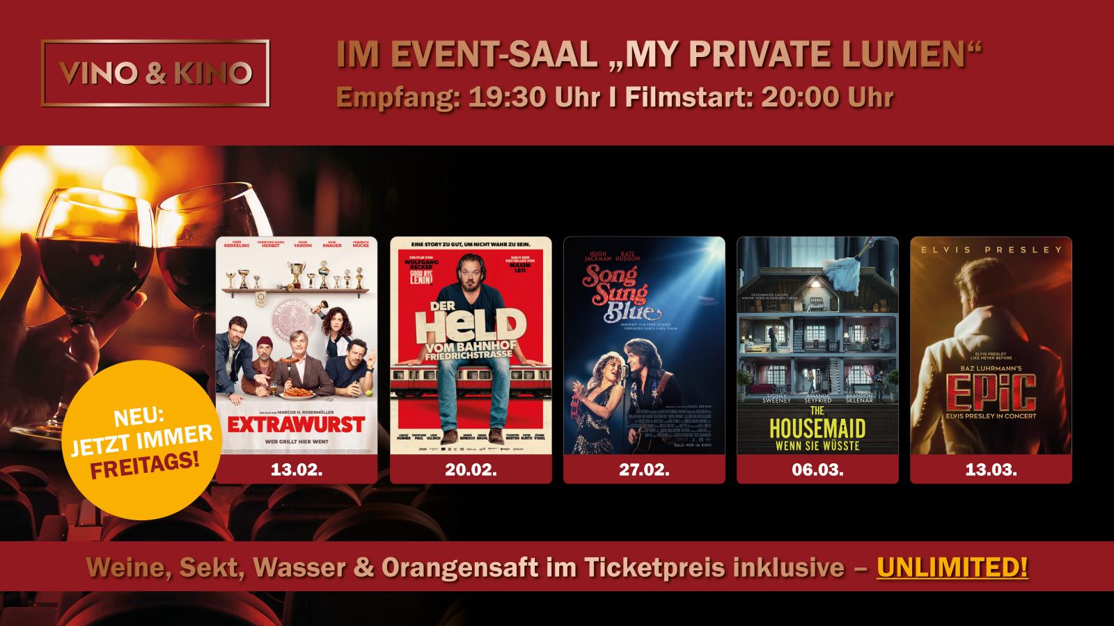 Bei unseren Vino & Kino Specials sind Wein, Sekt, Wasser und Saft während des Empfangs und der gesamten Vorstellung im Eintrittspreis inklusive!